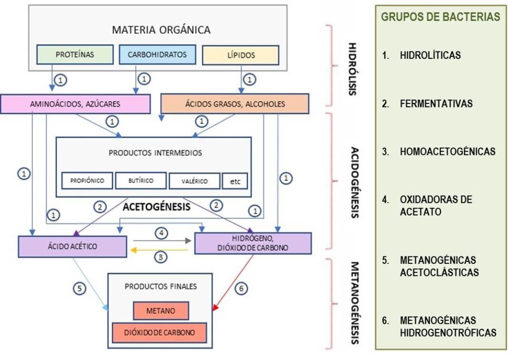 Biogás es el nombre genérico de los gases producidos como consecuencia de la digestión anaerobia o biometanización de los residuos orgánicos, con independencia de la materia prima y la técnica empleada. La degradación de la materia orgánica se realiza a través de una serie compleja de reacciones bioquímicas, que son llevadas a cabo por distintas familias de microorganismos, y en la que se establecen diferentes etapas (Figura 1).