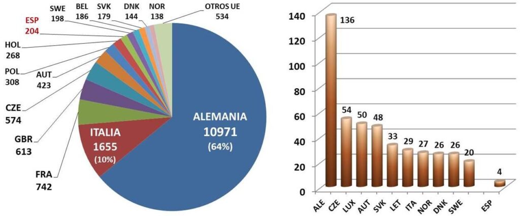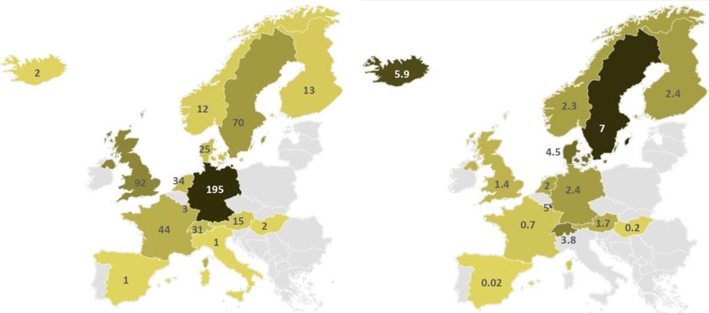 El crecimiento constante del número de plantas de biogás europeas durante la última década indica la robustez del sector. Según la Asociación Europea de Biogás (EBA), a finales de 2017, había 17.783 plantas de biogás en Europa y la capacidad eléctrica instalada alcanzó un total de 10.532 MW y la electricidad producida a partir de biogás ascendió a un total de 65.179 GWh (EBA, 2018). La distribución de las plantas por países y millón de habitantes, se se muestra en la Figura 2.