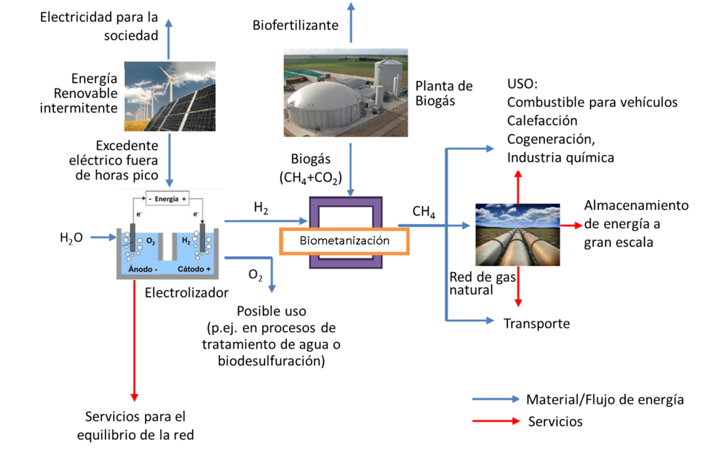 Por otra parte, el upgrading quimiotrófico se ha considerado muy positivamente en el caso de utilizar electricidad renovable en la hidrólisis del agua para obtener H2, especialmente en los casos en los que se emplea la electricidad residual de aerogeneradores o paneles solares. En este sentido, la metanización quimiotrófica se puede utilizar como una tecnología Power-to-Gas, ya que este método también sirve para almacenar la energía sobrante generada por aerogeneradores o módulos fotovoltaicos. El almacenamiento del exceso de energía eólica y solar es un desafío clave, dado que la seguridad de la planificación es necesaria para la estabilidad de la red eléctrica, para lo cual, las baterías presentan aún serios inconvenientes (Angelidaki et al., 2018). La electrólisis del agua que utiliza electricidad renovable produce O2, además de H2. De esta forma, la generación de H2, es una fuente de energía limpia y libre de emisiones de CO2, que se puede almacenar fácilmente en la infraestructura de gas natural existente, reduciendo así el coste de inversión inicial. Por otra parte, el contenido energético del CH4 (36 MJ/m3) es notablemente superior al del H2 (10,88 MJ/m3) (Luo et al., 2012). Finalmente, esta tecnología sirve como condición previa de sostenibilidad, dentro del ambicioso plan de desvincular la producción de biogás de la disponibilidad de biomasa.