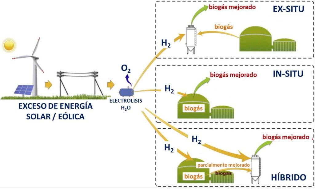 Los procesos en los que se produce la mejora del biogás mediante la aportación de hidrógeno se pueden clasificar en tres categorías (Figura 4): diseños in situ, ex situ e híbridos (Kougias et al., 2017b).